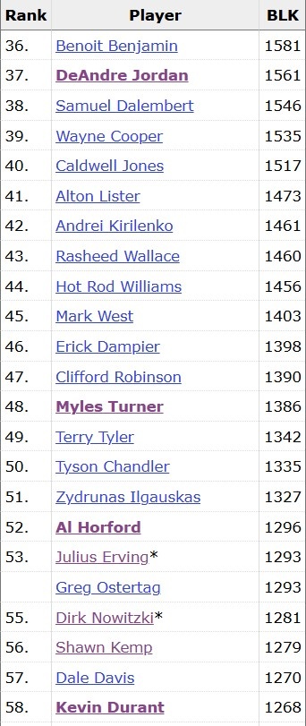 本場(chǎng)比賽過(guò)后,杜蘭特的常規(guī)賽生涯蓋帽總數(shù)來(lái)到1271次,超越戴爾-戴維斯,上升至NBA歷史第57位。