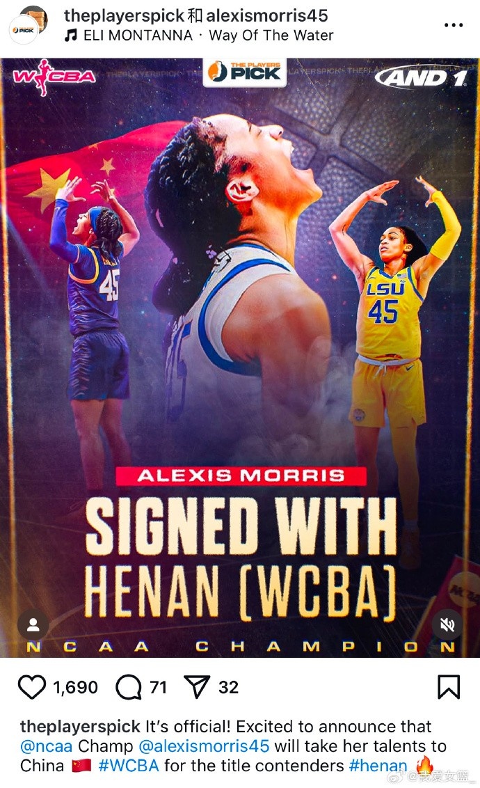 昨天深夜,據(jù)經(jīng)紀(jì)公司ThePlayersPick消息,原路易斯安那州立大學(xué)女籃后衛(wèi)艾里克西斯-莫里斯簽約河南女籃。艾里克西斯身高1米75,今年25歲,曾隨路易斯安那州立大學(xué)女籃奪得2023年NCAA全國(guó)冠軍。2023年WNBA選秀總第22順位被康涅狄格太陽(yáng)隊(duì)選中。
