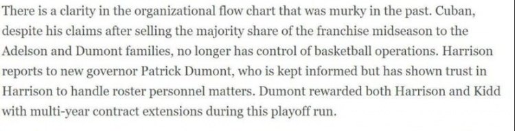 2024年6月底,選秀大會前夕,據(jù)ESPN的麥克馬洪報道,庫班已經(jīng)不再參與獨行俠隊的運營工作,而由獨行俠隊的總經(jīng)理哈里森,直接向新老板杜蒙特匯報。