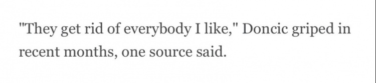 有消息稱,獨行俠曾經(jīng)向另一支球隊出售東契奇,試圖得到想要的球員,但遭到拒絕。但隊記方面對這一消息認為不可信——一方面,其他球隊從未印證這一說法,而另一方面,“他從頭到尾,只想要戴維斯一個人?!?/p>