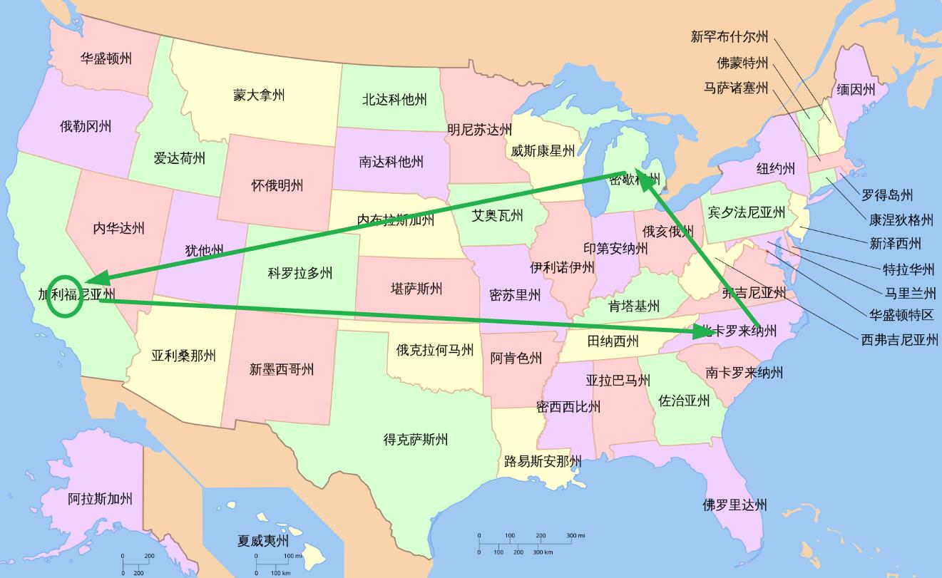 ??克內(nèi)克特一周飛行路線:LA→夏洛特→底特律→LA
