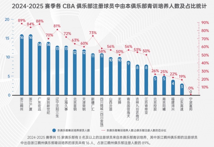 其中,浙江的注冊(cè)球員中自家青訓(xùn)培養(yǎng)的有16人,占比高達(dá)89%排第一;