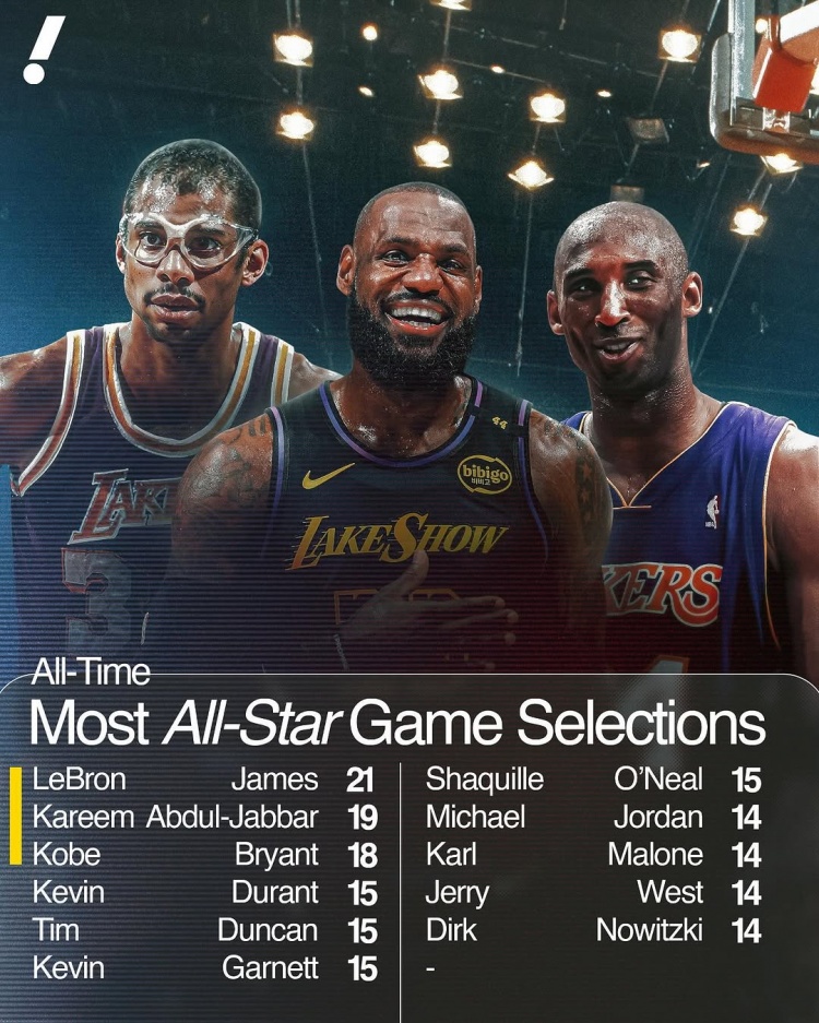 全明星次數(shù)總榜:詹姆斯21次高居榜首 科比第三 KD與三大名宿并列