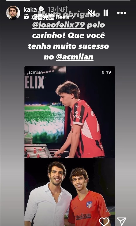 2月17日訊 不久前,米蘭名宿卡卡更新了社交媒體,感謝菲利克斯對他的贊美。