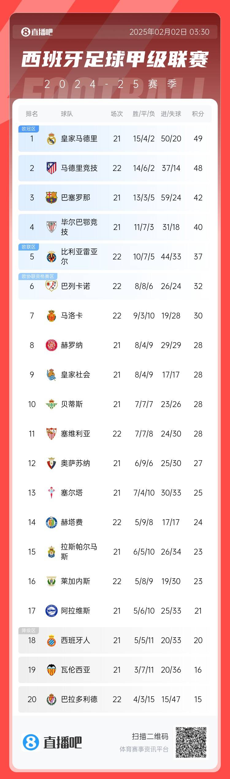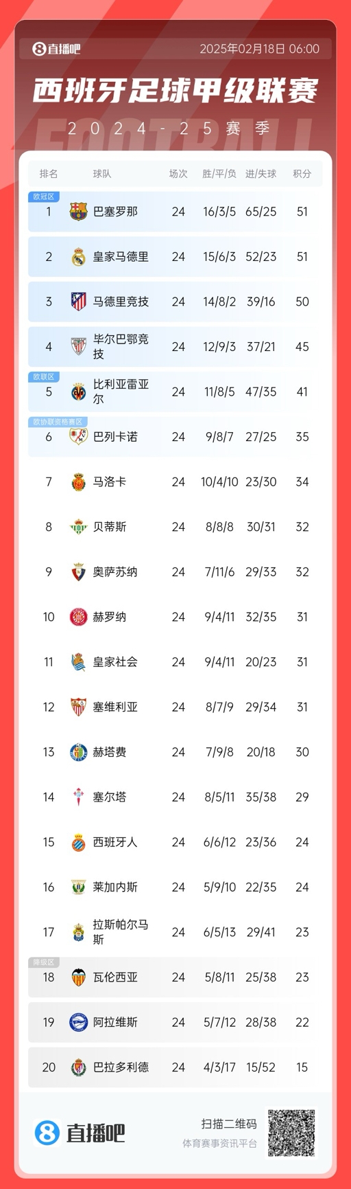 2月18日訊 西甲第24輪,巴塞羅那1-0小勝巴列卡諾,重回西甲榜首,憑借凈勝球優(yōu)勢(shì)力壓皇馬。