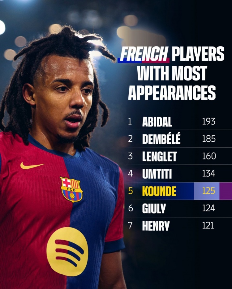 巴薩官方社媒曬出隊史法國球員出場次數(shù)榜單,孔德為巴薩出戰(zhàn)125場比賽,超越久利,排名第5位。
