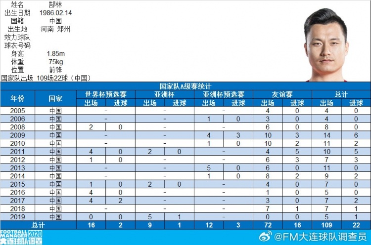 2月18日訊 在2月16日中國足協(xié)為郜林舉辦退役儀式后,博主“FM大連球隊調(diào)查員”在社媒公布了郜林的生涯數(shù)據(jù)統(tǒng)計。
