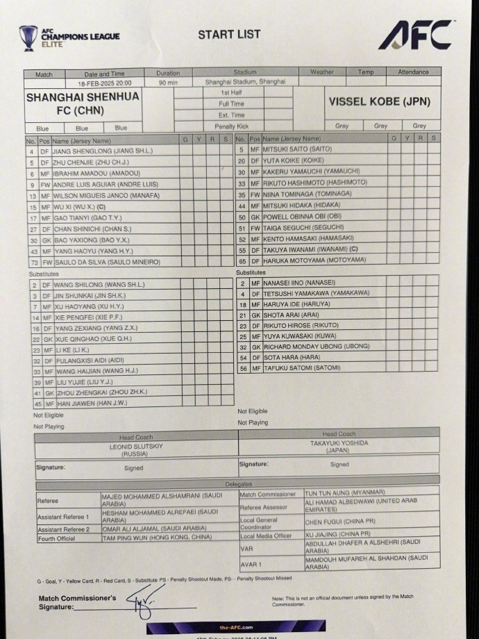 2024/25亞冠精英聯(lián)賽第8輪 上海申花vs神戶勝利船 首發(fā)名單 ???