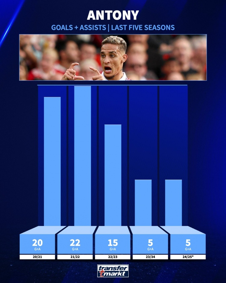 安東尼近5個(gè)賽季參與進(jìn)球數(shù)量(所有俱樂(lè)部賽事):