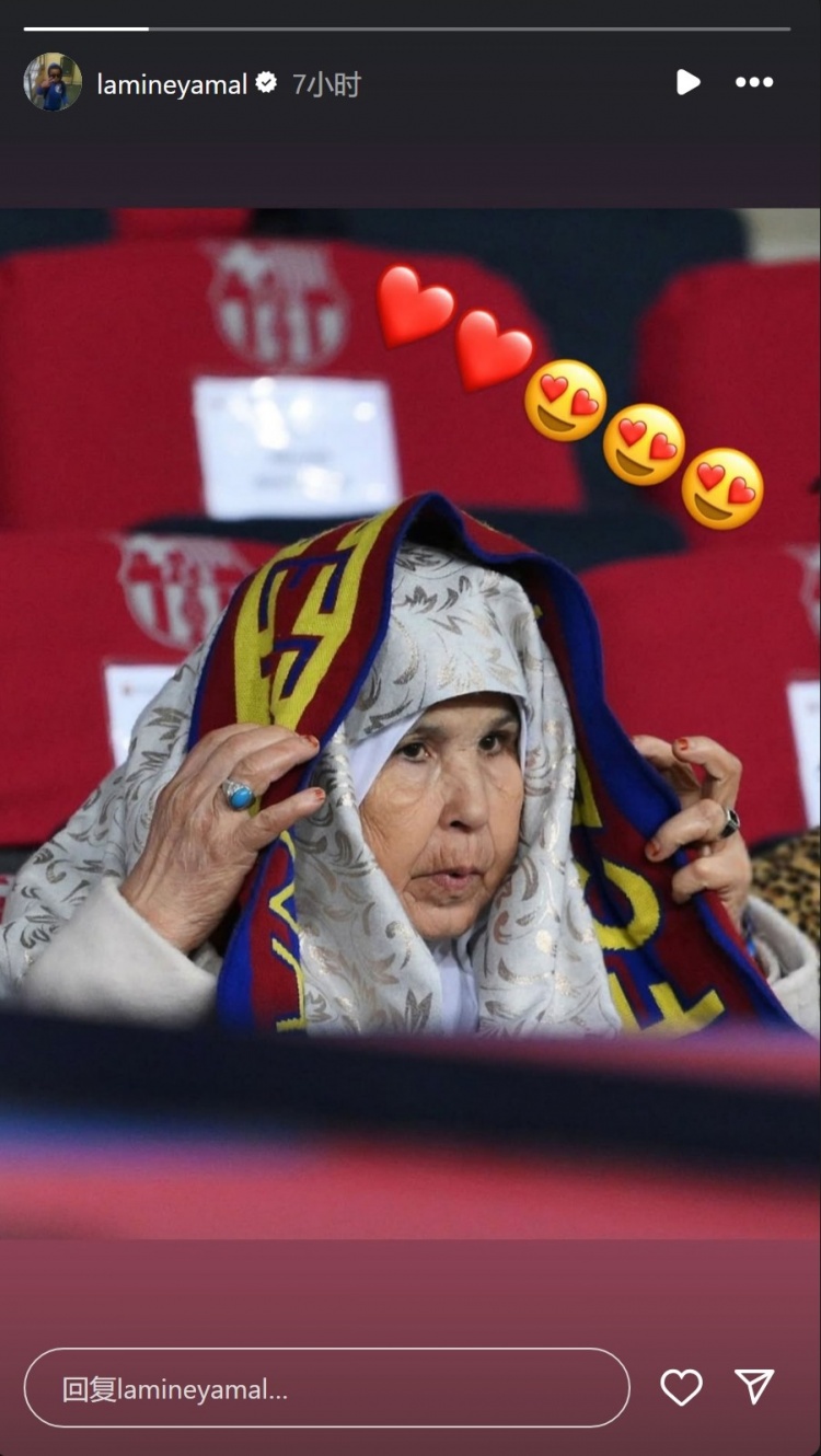 亞馬爾的祖母來到現(xiàn)場觀看比賽,亞馬爾在社交媒體上曬出祖母的照片,并配上了紅心表情符號。
