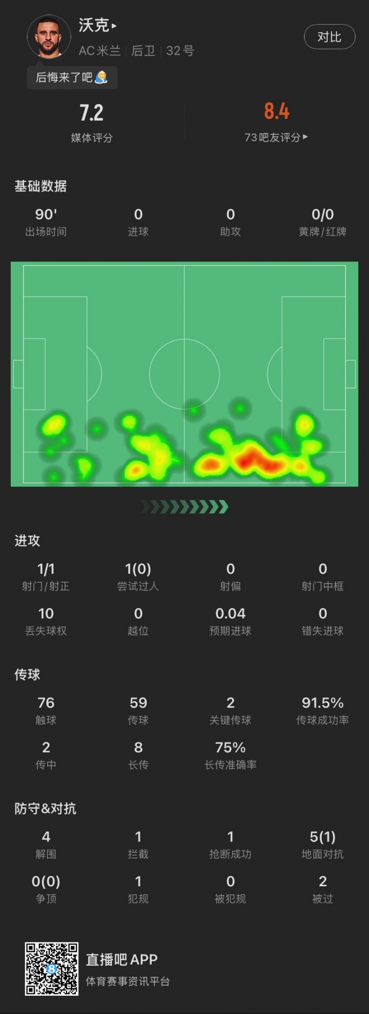 2月19日訊 在剛剛結(jié)束的歐冠淘汰賽階段附加賽中,米蘭1-1戰(zhàn)平費耶諾德,總比分1-2出局。本場比賽,34歲的沃克打滿全場,獲評7.2分。
