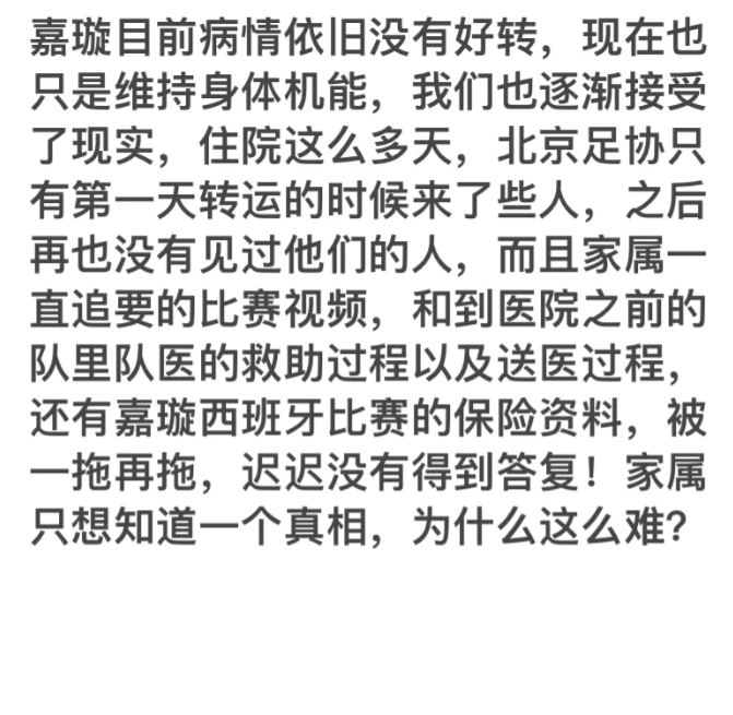 嘉璇目前病情依舊沒有好轉(zhuǎn),現(xiàn)在也只是維持身體機能,我們也逐漸接受了現(xiàn)實,住院這么多天,北京足協(xié)只有第一天轉(zhuǎn)運的時候來了些人,之后再也沒有見過他們的人,而且家屬一直追要的比賽視頻,和到醫(yī)院之前的隊里隊醫(yī)的救助過程以及送醫(yī)過程,還有嘉璇西班牙比賽的保險資料,被一拖再拖,遲遲沒有得到答復(fù)!家屬只想知道一個真相,為什么這么難?