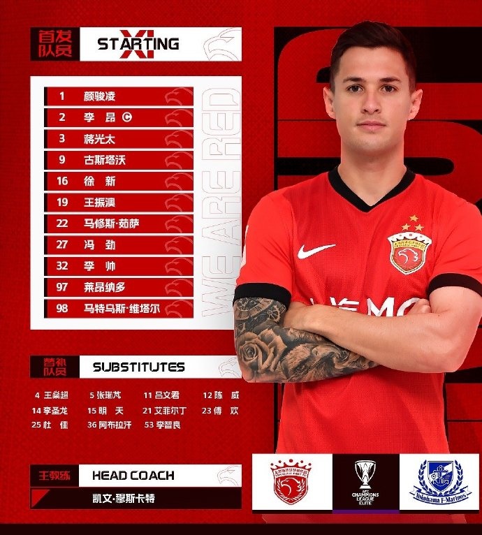 亞冠精英聯(lián)賽第8輪上海海港vs橫濱水手,今日首發(fā)名單