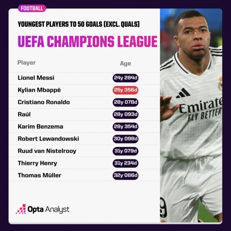 首回合對皇馬哈蘭德打進(jìn)兩球,將個人歐冠進(jìn)球數(shù)提升至49球,如果次回合哈蘭德再度攻破皇馬球門,那他將以24歲213天的年齡,成為最快達(dá)成歐冠50球的球員。