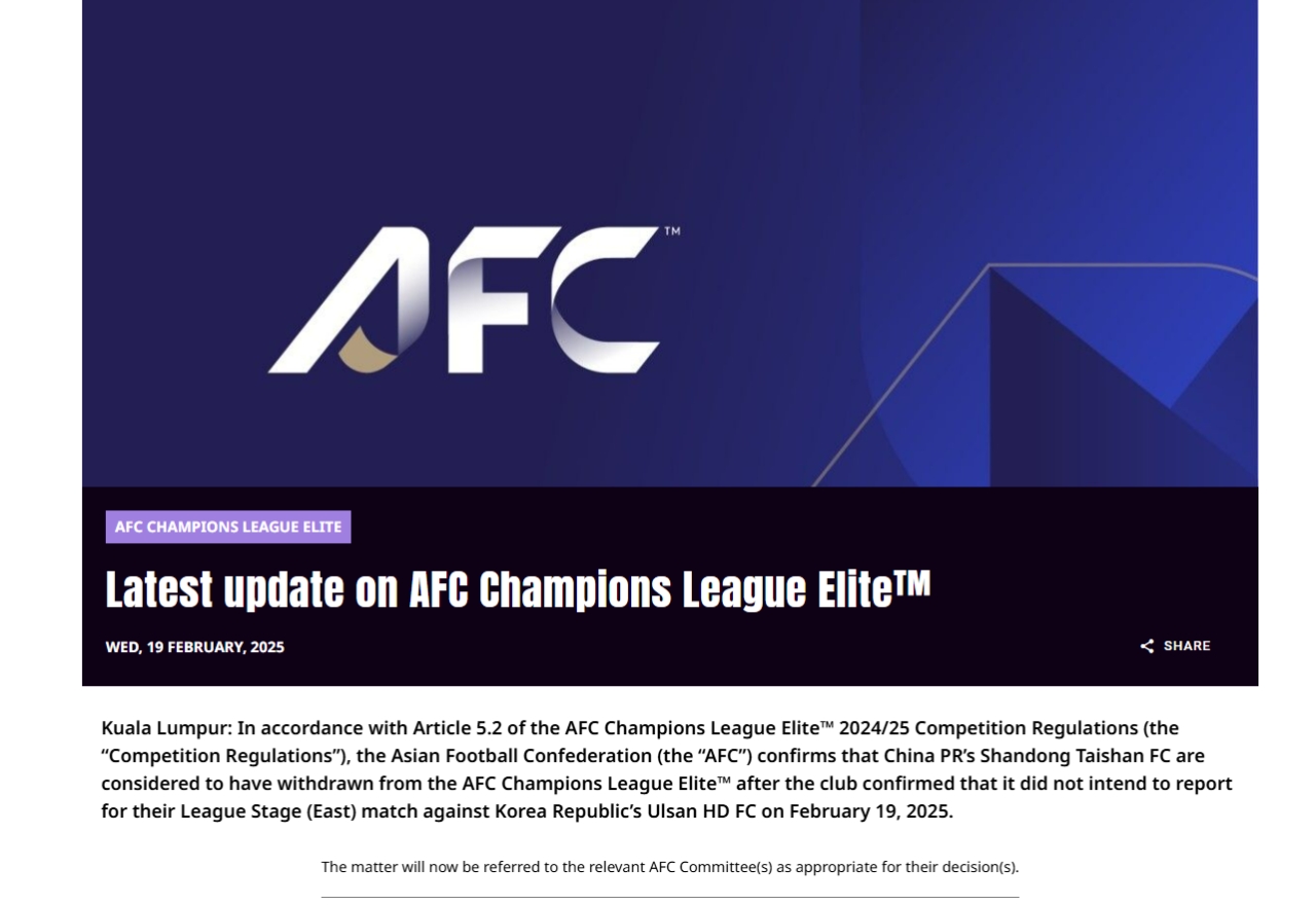 根據(jù)《亞足聯(lián)冠軍聯(lián)賽精英賽2024/25競賽規(guī)程》(簡稱"競賽規(guī)程")第5.2條款規(guī)定,亞足聯(lián)確認(rèn)中國山東泰山足球俱樂部因明確表示不參加原定于2025年2月19日與韓國蔚山HD足球俱樂部進(jìn)行的東亞區(qū)聯(lián)賽階段賽事,現(xiàn)被視為退出本屆亞足聯(lián)冠軍聯(lián)賽精英賽。