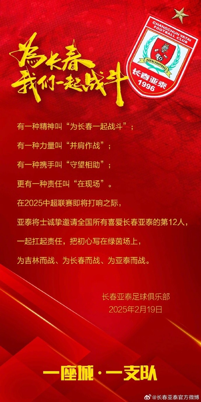 有一種精神叫“為長春一起戰(zhàn)斗”,有一種力量叫“并肩作戰(zhàn)”,有一種攜手叫“守望相助”,更有一種責任叫“在現(xiàn)場”……由于長春亞泰一直保留了將現(xiàn)役的“12號”留給第12人的傳統(tǒng),因此在出征儀式上,俱樂部特意準備了一件簽滿全體教練員和球員的12號戰(zhàn)袍,由曾皎峰和謝暉共同拿起這件戰(zhàn)袍和全隊合影,希望全國所有喜愛長春亞泰的第12人,一起為吉林而戰(zhàn)、為長春而戰(zhàn)、為亞泰而戰(zhàn)。