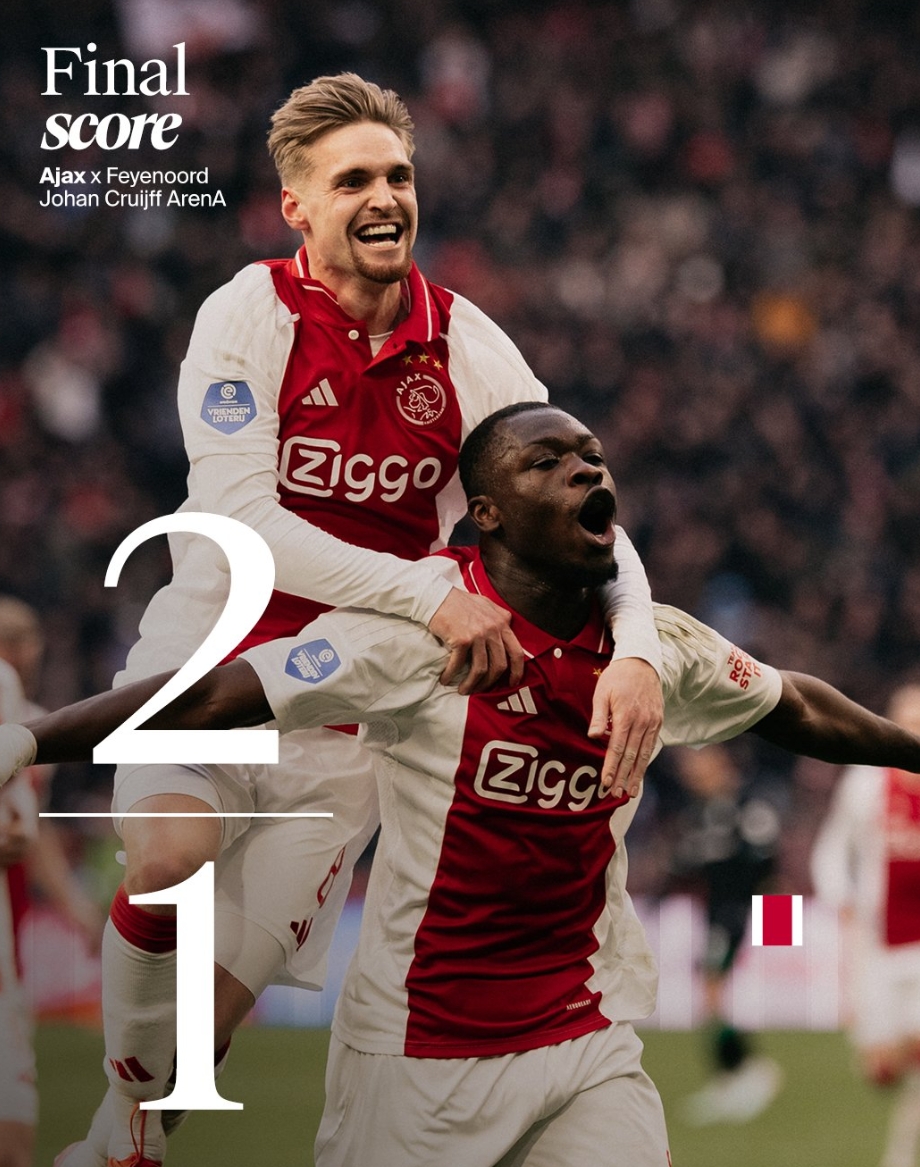 荷甲國(guó)家德比,阿賈克斯2-1費(fèi)耶諾德。上半場(chǎng),布羅比機(jī)敏補(bǔ)射破門;下半場(chǎng),廷貝爾扳平比分,韋霍斯特點(diǎn)球被撲,泰勒絕殺。