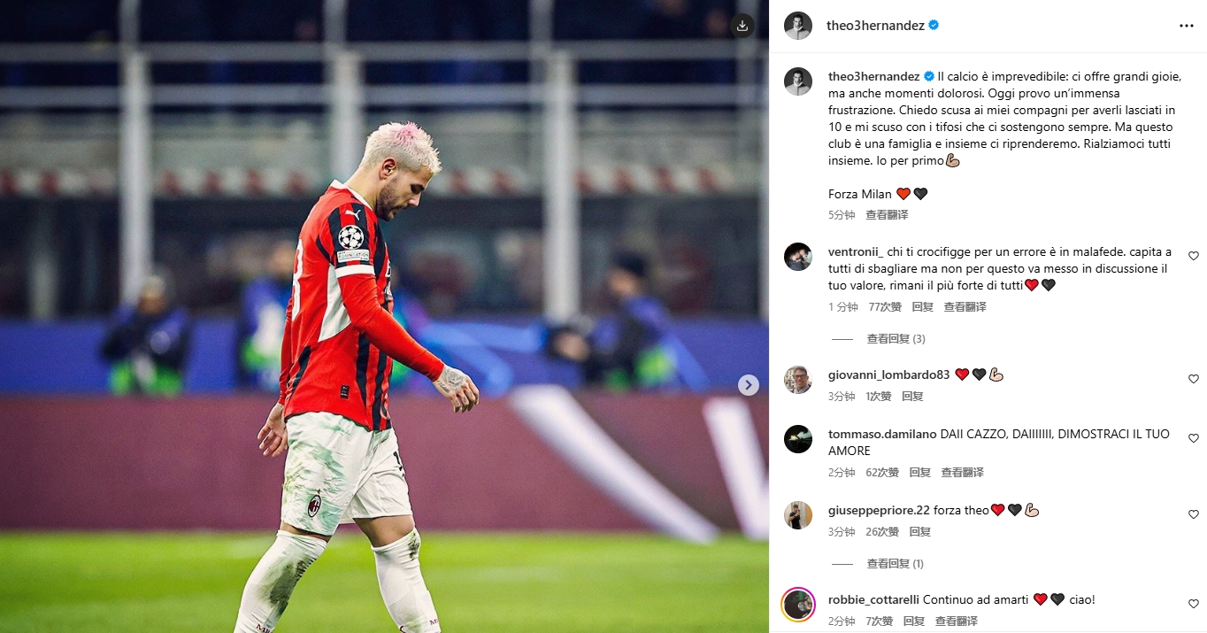 02月20日訊 歐冠附加賽次回合,特奧假摔染紅,米蘭遭費(fèi)耶諾德淘汰。特奧發(fā)文致歉。