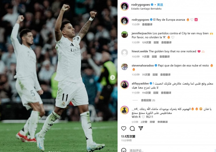 2月20日訊 皇馬在本輪歐冠3-1擊敗曼城,羅德里戈通過(guò)社媒曬照紀(jì)念晉級(jí)。