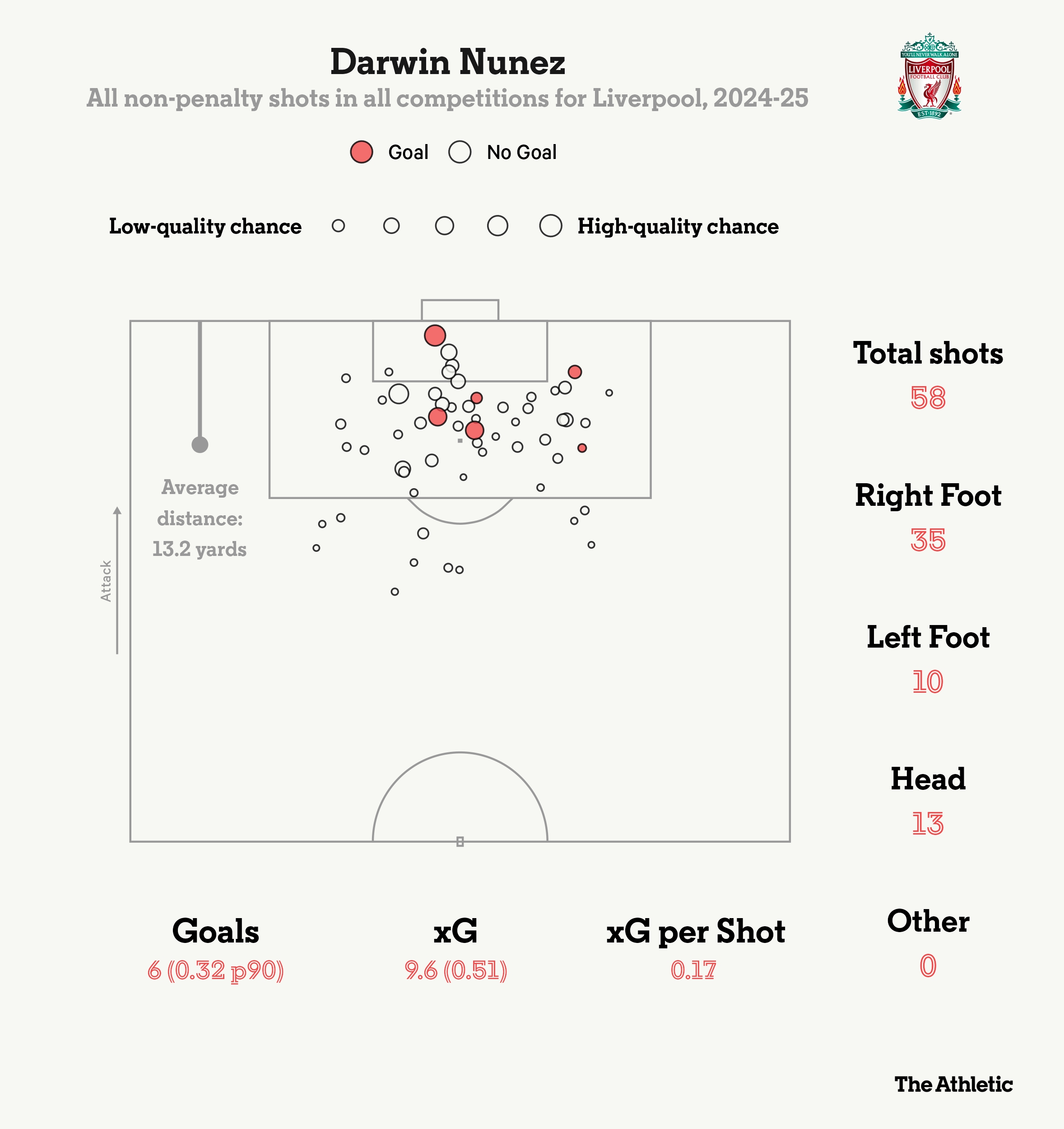小禁區(qū)附近扎堆丟!努涅斯射門分布:預期進球9.6球 實際只進6球