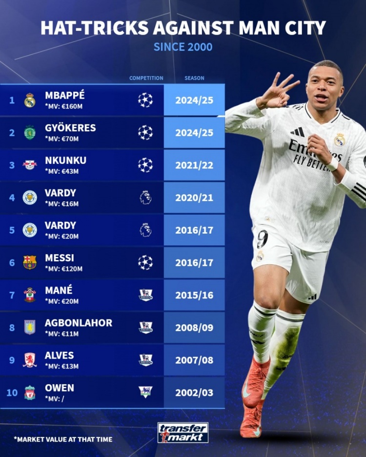 德國轉(zhuǎn)會(huì)市場盤點(diǎn)了本世紀(jì)以來對陣曼城戴帽的球員,梅西、姆巴佩、歐文在列,瓦爾迪2次對陣曼城戴帽。