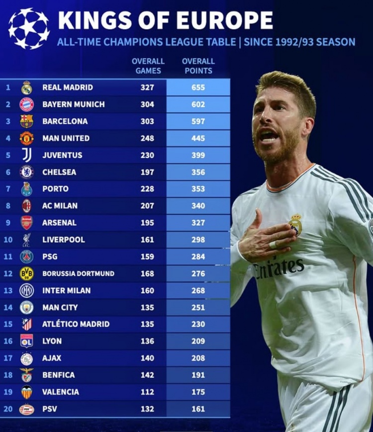 2月21日訊 歐冠淘汰賽附加賽已經結束,《轉會市場》也統(tǒng)計了92-93賽季改制后的歐冠歷史積分榜,皇馬無懸念領跑。