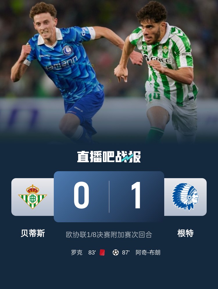 歐協(xié)聯(lián)-貝蒂斯0-1總比分3-1根特進(jìn)16強(qiáng) 安東尼出戰(zhàn)59分鐘羅克染紅