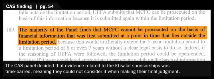 CAS三人小組中的兩人駁回了曼城通過伊蒂哈德航空和阿聯(lián)酋電信收到變相付款(或者說是“假贊助”)的主要指控,認(rèn)為所有與阿聯(lián)酋航空付款有關(guān)的“證據(jù)”都已經(jīng)超過時效,伊蒂哈德航空的付款也是如此。并且無論如何,提供錯誤信息的指控尚未成立。