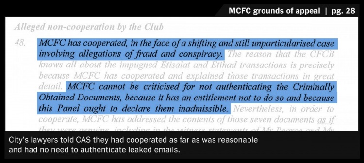 曼城向CAS提出了上訴,聲稱他們不必對泄露的郵件進(jìn)行身份驗(yàn)證,并認(rèn)為它們超出了審查小組的需要。