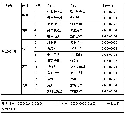 傳足勝負(fù)彩第25028期競(jìng)猜賽事涵蓋五大聯(lián)賽,其中英超曼城VS利物浦是全歐關(guān)注的焦點(diǎn),此外拜仁、尤文和皇馬等豪門(mén)也將陸續(xù)出戰(zhàn)。