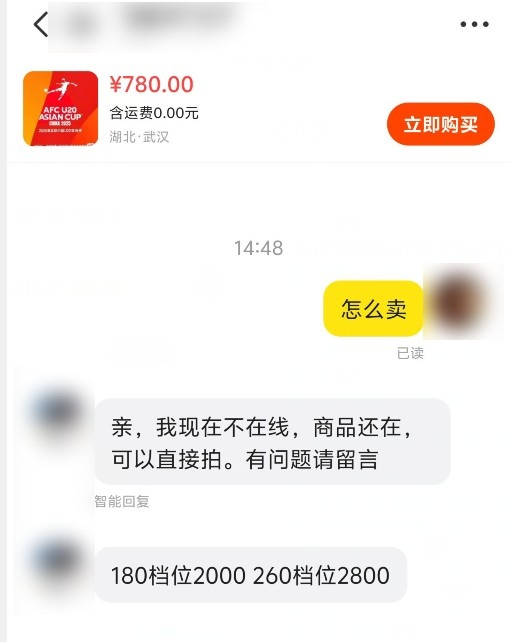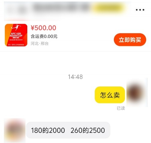 本場比賽門票開票后,1分鐘就售罄,銷售異?;鸨?!目前,有黃牛已經(jīng)將原價180元的門票炒至1000-2000元,其他價位的門票價格更高。