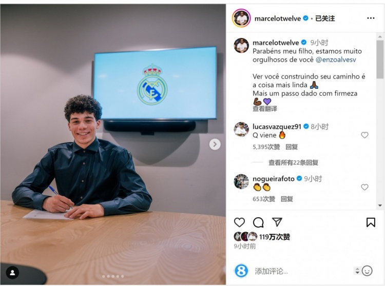 馬塞洛15歲兒子恩佐與皇馬續(xù)約,馬塞洛在社交媒體上曬出恩佐簽字的照片,配文:“祝賀你,我的兒子,我們?yōu)槟愀械津湴痢!?/p>