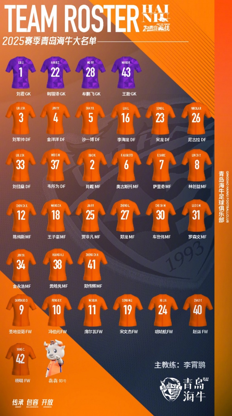 2025賽季青島海牛一線隊大名單,新賽季一起為青島而戰(zhàn)!