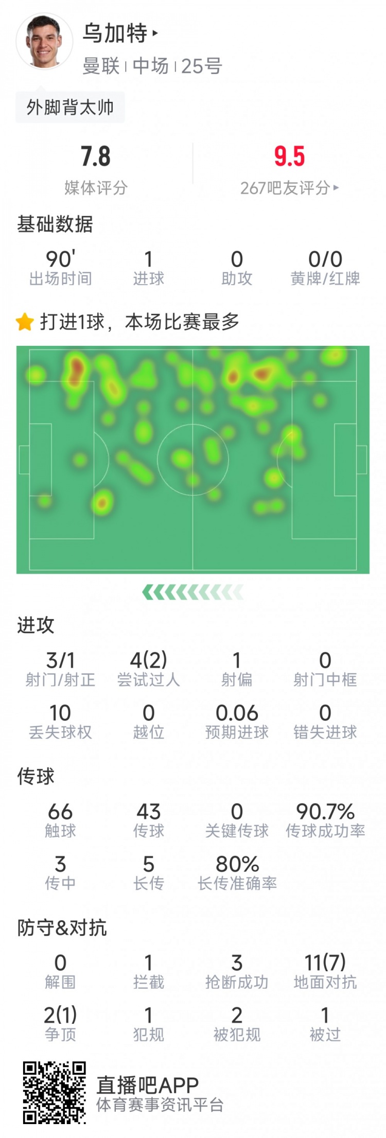 2月22日訊 在本輪英超,曼聯(lián)2-2戰(zhàn)平埃弗頓。烏加特打進(jìn)扳平進(jìn)球,以下為他在本場數(shù)據(jù):