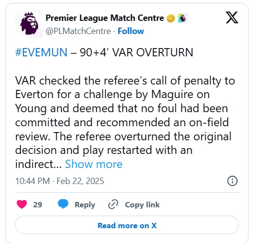 英超官方比賽中心隨后給出了更為官方的說法,VAR檢查了裁判給埃弗頓的點球判罰,認(rèn)為馬奎爾對阿什利楊并沒有犯規(guī),建議主裁對回放進行審查。主裁判最終推翻了原有判罰,并以間接任意球重新開始比賽。