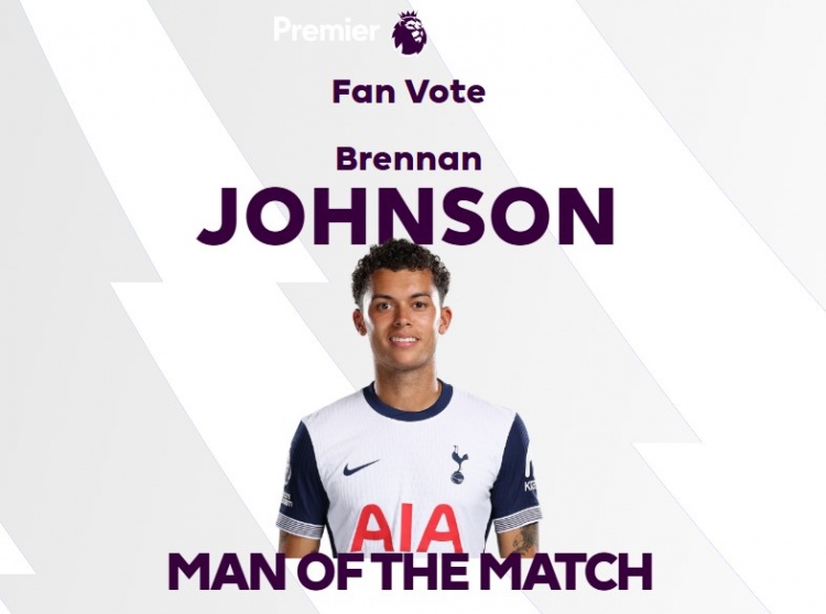 梅開(kāi)二度!官方:布倫南-約翰遜當(dāng)選熱刺4-1伊普斯維奇全場(chǎng)最佳
