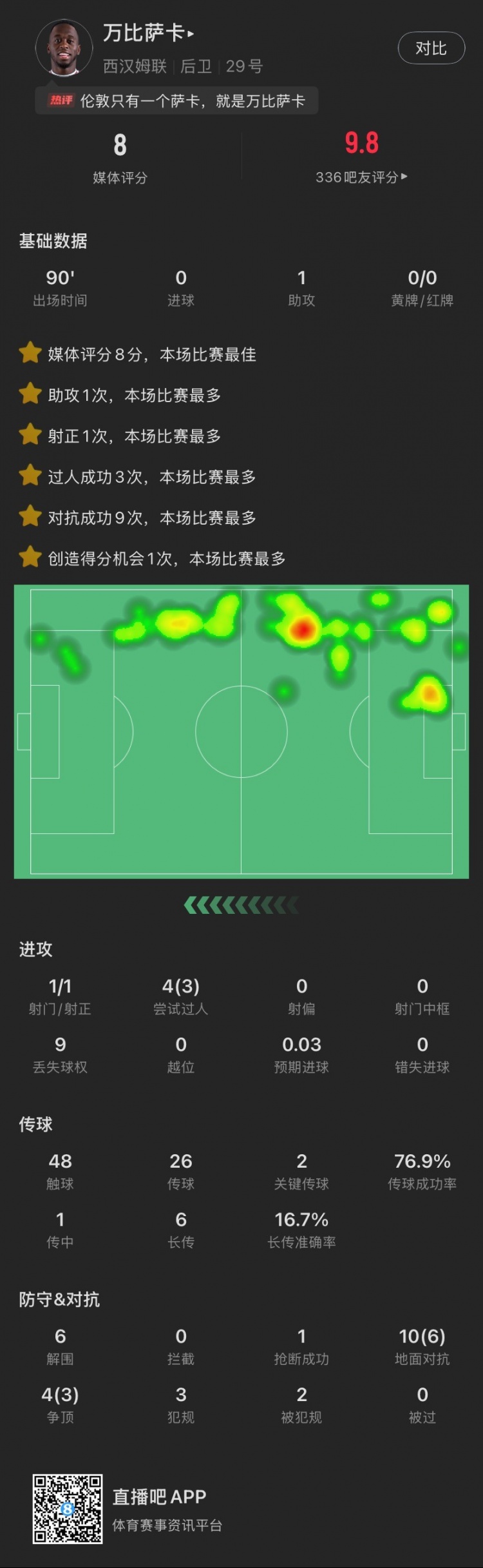 2月23日訊 在剛剛結(jié)束的英超比賽中,西漢姆1-0擊敗阿森納。本場(chǎng)比賽,曼聯(lián)舊將萬(wàn)-比薩卡發(fā)揮出色,送出1助攻,獲評(píng)8分全場(chǎng)最高。