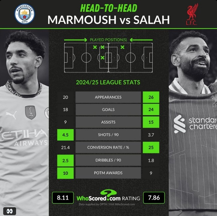 2月23日訊 本輪英超將迎來曼城與利物浦的焦點(diǎn)對話,也是兩位埃及前鋒薩拉赫、馬爾穆什首次在英超交鋒,數(shù)據(jù)網(wǎng)站W(wǎng)hoscored對比了本賽季兩人在聯(lián)賽中的數(shù)據(jù),具體如下: