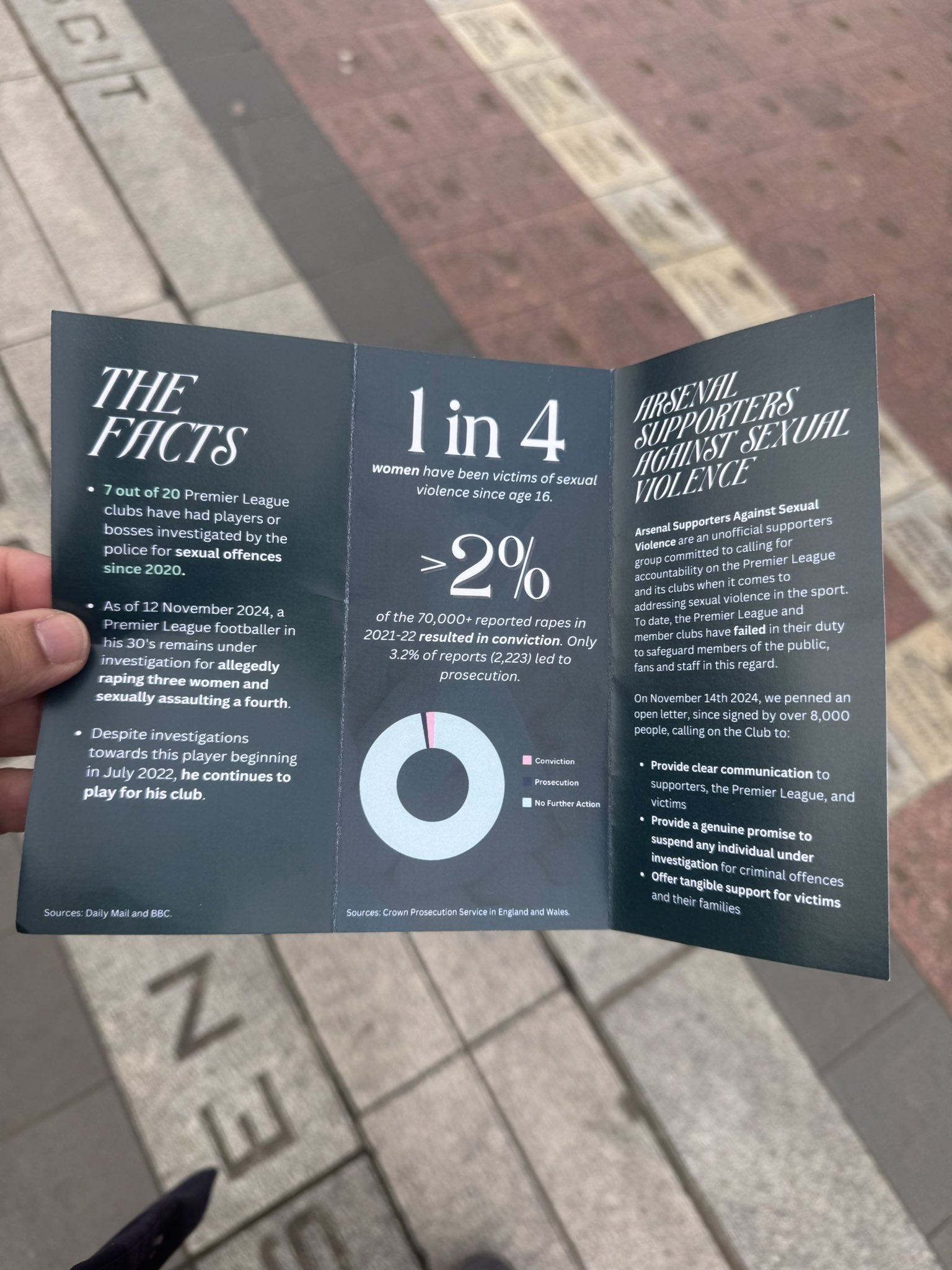 其中一頁寫道:“阿森納球迷反對性暴力組織是一個非官方的支持者團體,致力于呼吁英超聯(lián)賽及其俱樂部在解決體育運動中的性暴力問題時承擔責任。迄今為止,英超聯(lián)賽及其成員俱樂部在這方面未能盡到保護公眾、球迷和工作人員的責任?!?/p>