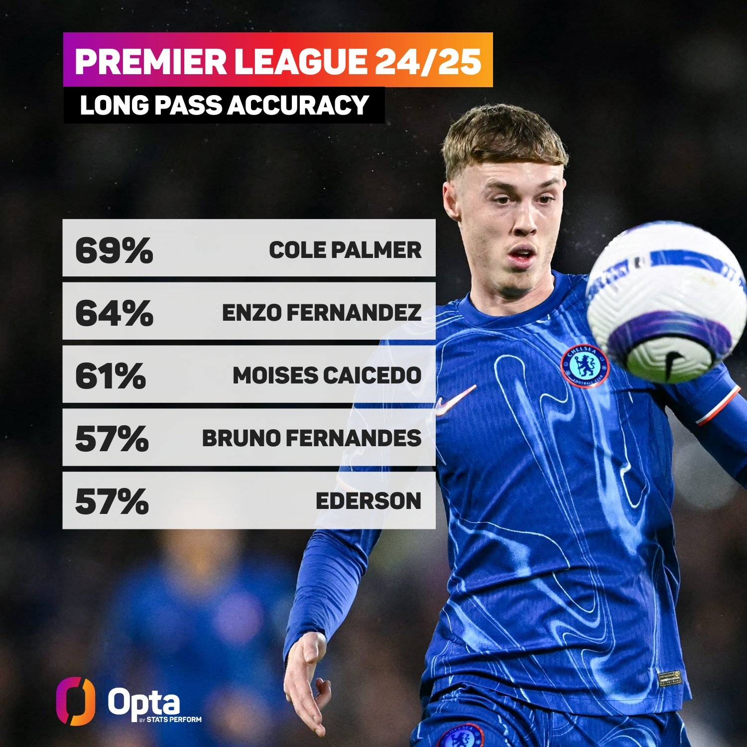 3月1日訊 根據(jù)OPTA統(tǒng)計(jì),帕爾默是本賽季英超長傳成功率最高的球員。