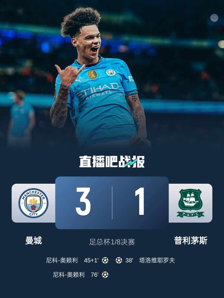 曼城足總杯3-1擊敗普利茅斯,奧賴?yán)p響建功,丁丁傳射。
