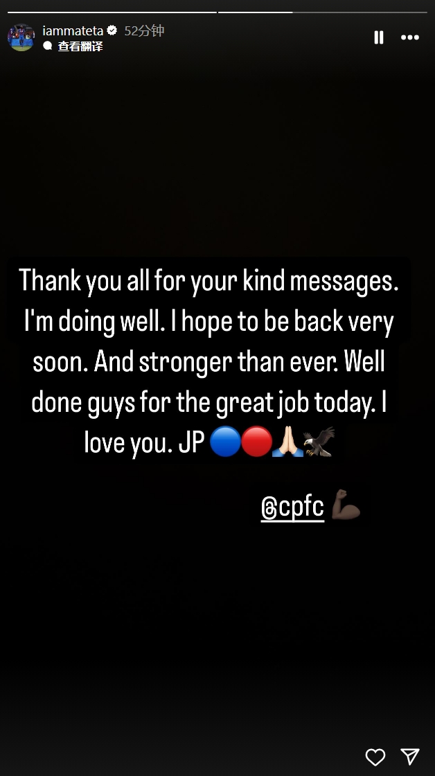 賽后馬特塔在社媒發(fā)文報(bào)平安:“感謝大家充滿溫暖的消息,我現(xiàn)在感覺(jué)很好,希望很快就能回歸,而且會(huì)是比以往任何時(shí)候都更強(qiáng)大的姿態(tài),大家今天踢得很棒,我愛(ài)你們。”