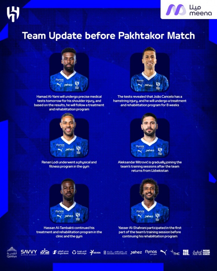 3月3日訊 利雅得新月官方更新了隊內6位球員的最新傷病情況,其中坎塞洛腿筋受傷,預計傷停8周。