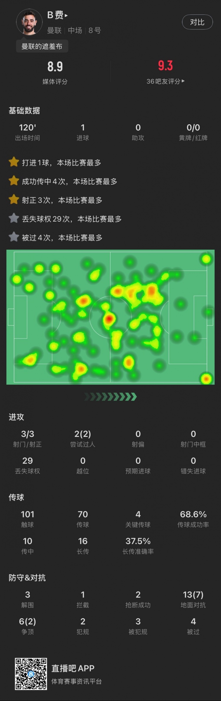 盡力局!B費本場:3射3正打進1球,4次關鍵傳球,19次對抗成功9次