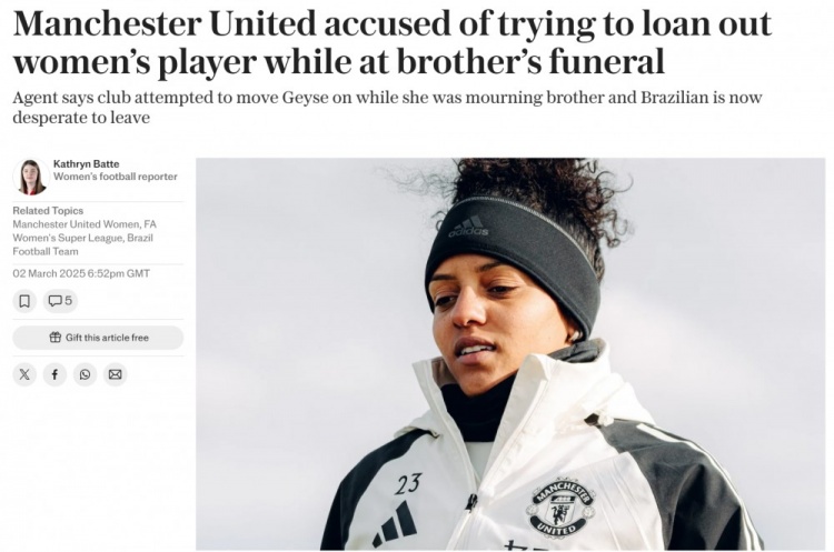 巴西女足球員蓋斯在2023年以創(chuàng)紀錄的轉會費從巴塞羅那轉會曼聯,但現在,她在俱樂部過得并不開心,想要離開。蓋斯的經紀人路易斯-費利佩-席爾瓦告訴《電訊報》,球員在一月份回巴西參加去世哥哥的葬禮時,曼聯曾試圖將她租借到美國的俱樂部。