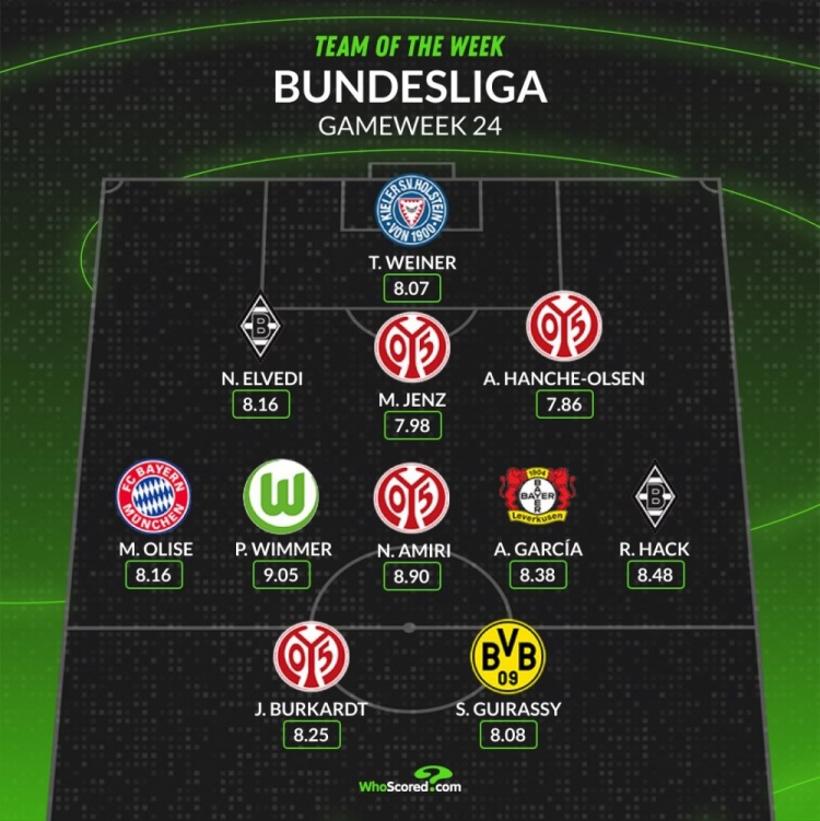 3月3日訊 德甲第24輪聯(lián)賽已經(jīng)完賽,whoscored也統(tǒng)計(jì)了本輪德甲評(píng)分最佳陣容,美因茨成為最大贏家。