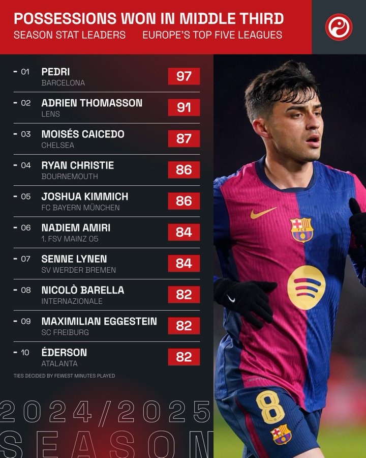 3月4日訊 Squawka統(tǒng)計表明,佩德里是本賽季五大聯(lián)賽在中場區(qū)域搶回球權(quán)次數(shù)最多的球員。