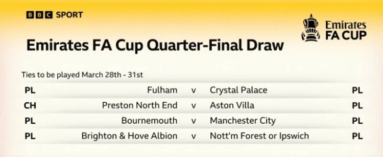 3月4日訊 在諾丁漢森林總比分6-5淘汰伊鎮(zhèn)后,本賽季足總杯8強(qiáng)球隊(duì)出爐。