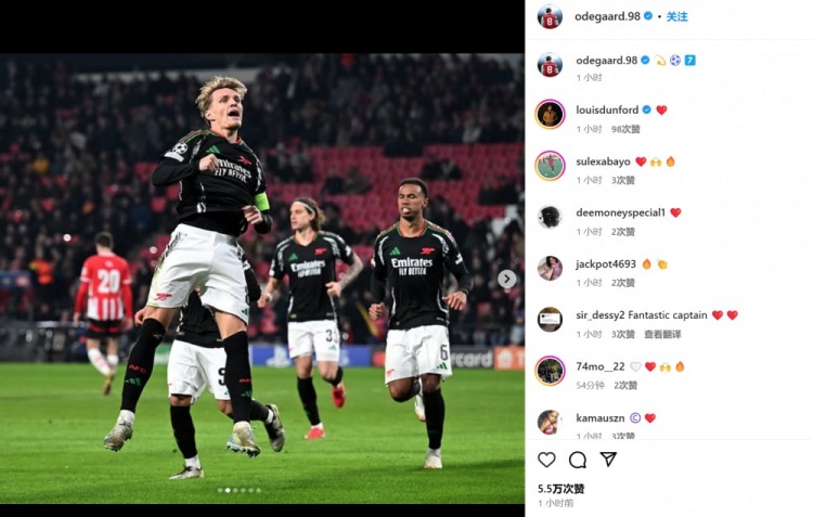 厄德高在本場比賽2射1傳,賴斯也送出1次助攻,兩人都通過社媒曬出自己的慶祝照,并簡單配文“7”。