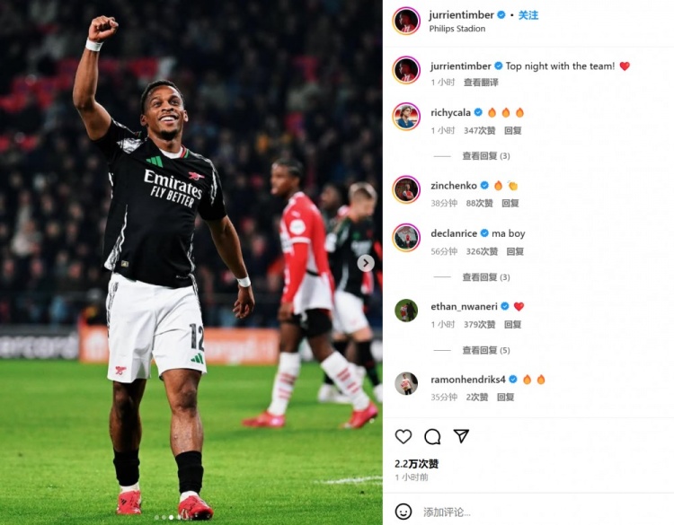 廷伯在本場比賽為槍手第18分鐘頭球首開記錄,他也曬出慶祝照并配文:“全隊表現(xiàn)頂級的一晚!”